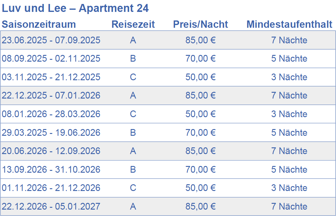 Belegzeitenkalender für Luv und Lee Apartment 24