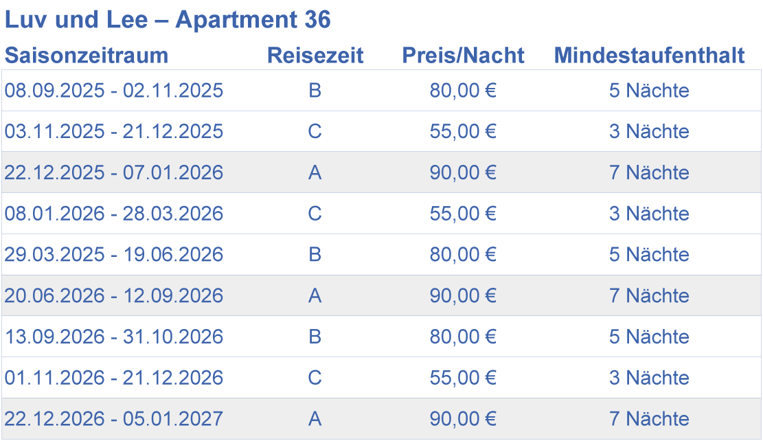 Belegzeitenkalender für Luv und Lee Apartment 36