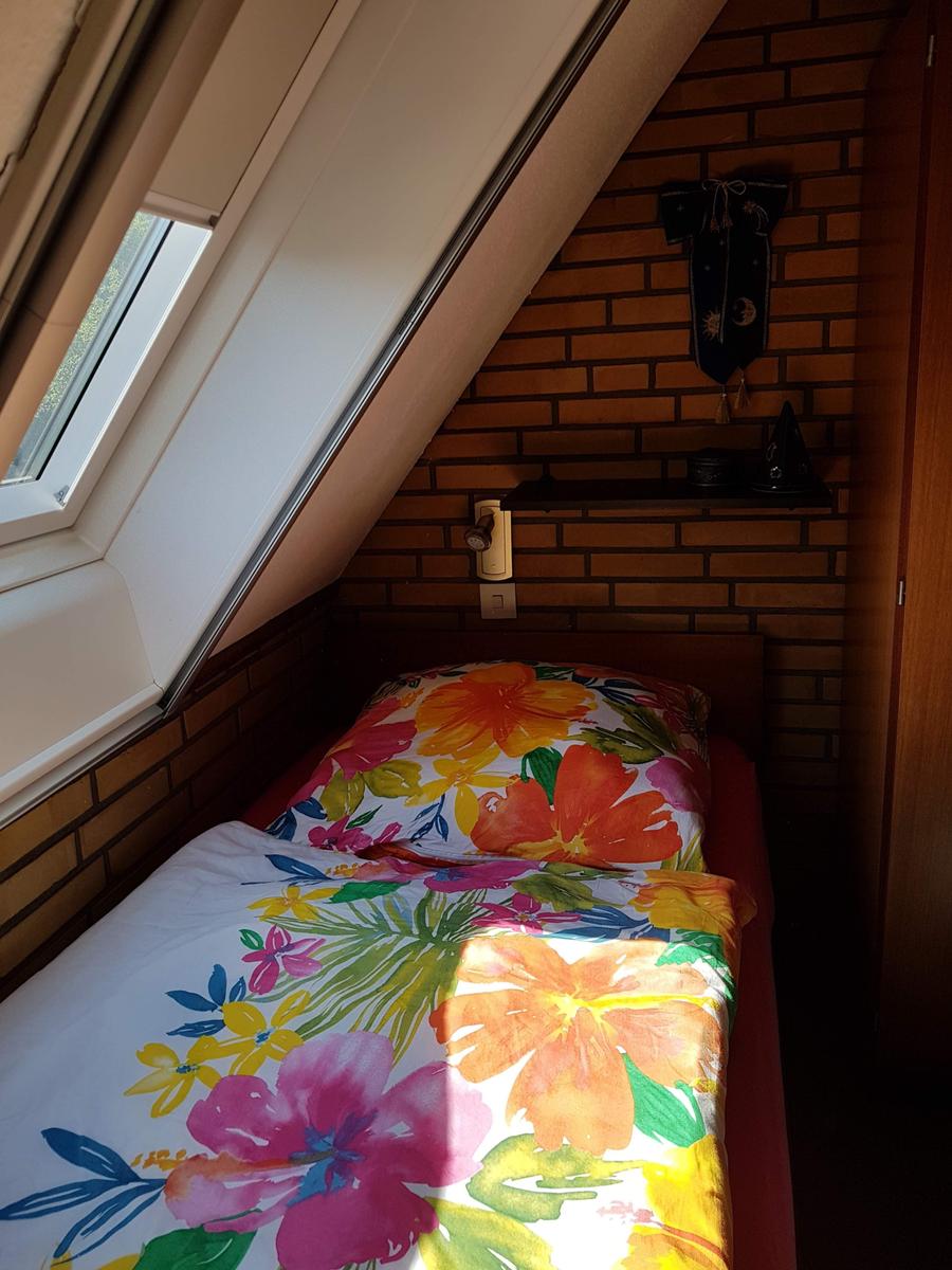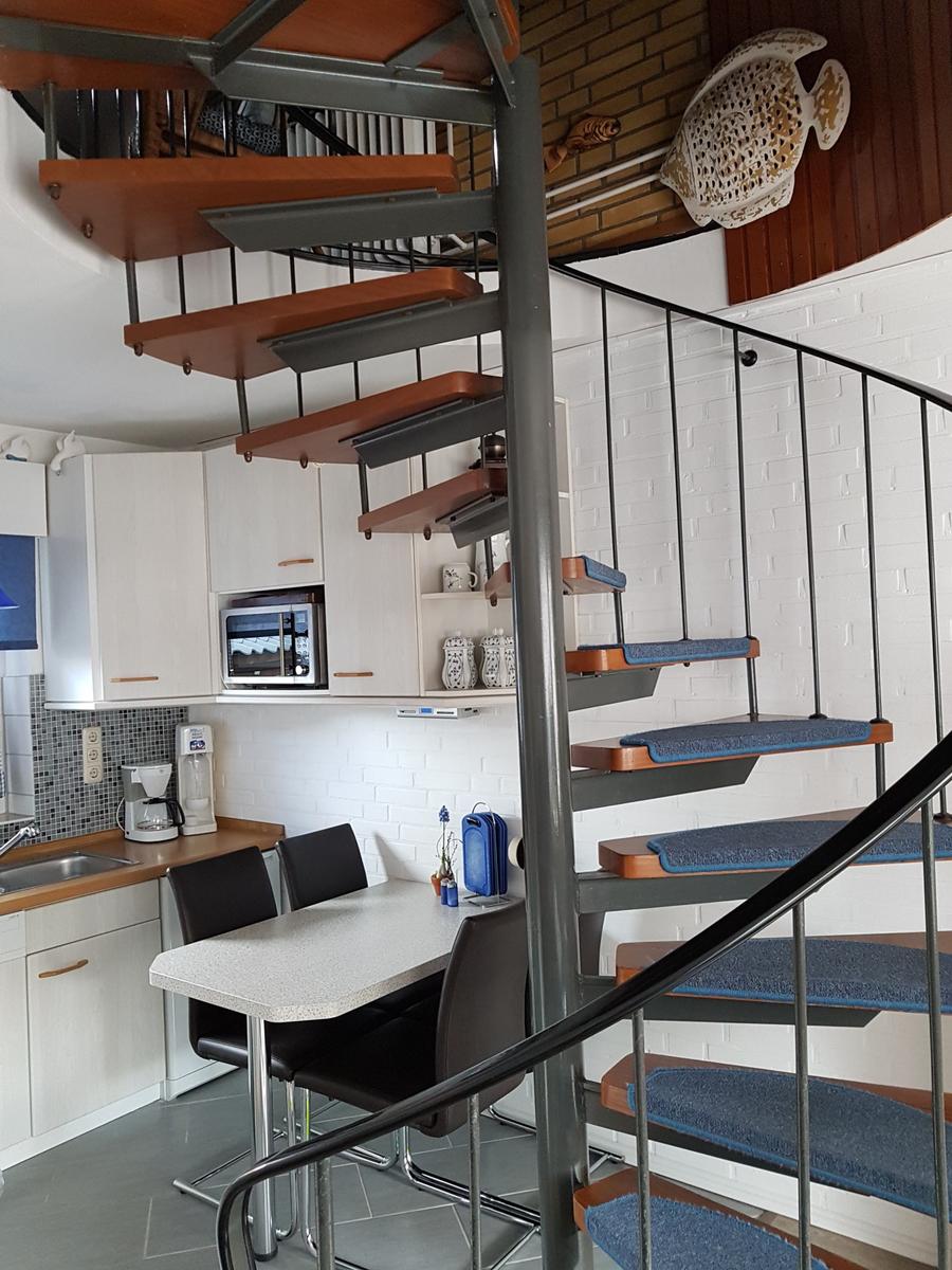 Die Wohnung besteht aus zwei Etagen. Unten Wohnraum mit Küche und Bad. Oben separater Schlafraum mit zwei Einzelbetten. Davor weitere Schlafmöglichkeit in einem Doppelbett (140m). Eine offene Wendeltreppe verbindet diesen Teil mit dem Wohnraum unten.