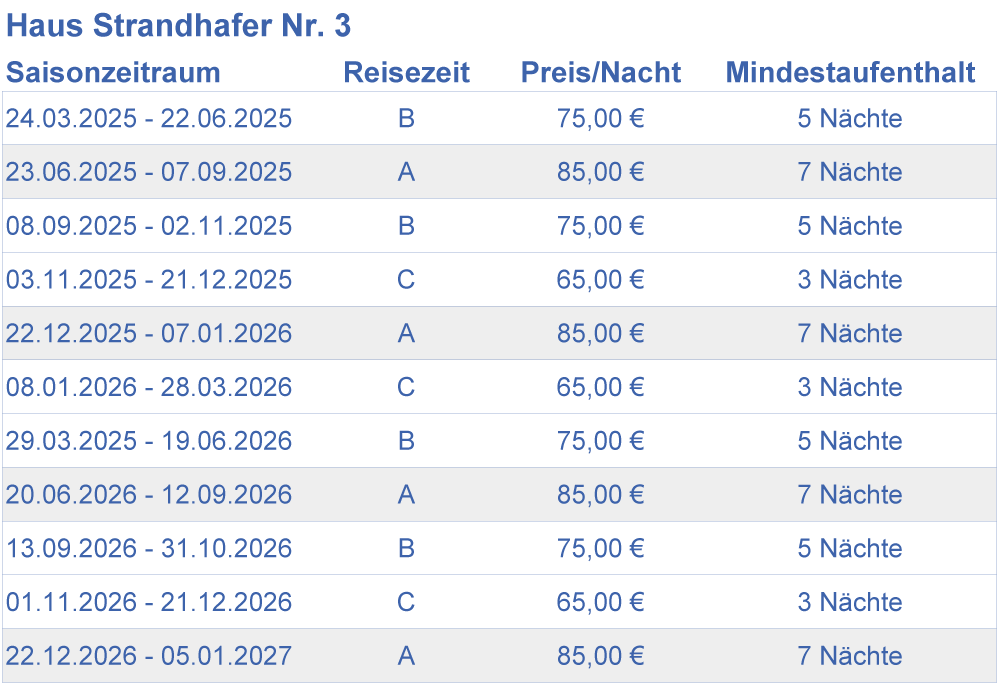 Alle Übernachtungspreise beziehen sich auf die komplette Wohneinheit. Für Kurzurlaube mit bis zu 3 Nächten Aufenthalt wird einmalig ein Zuschlag in Höhe von 30,00 € erhoben.