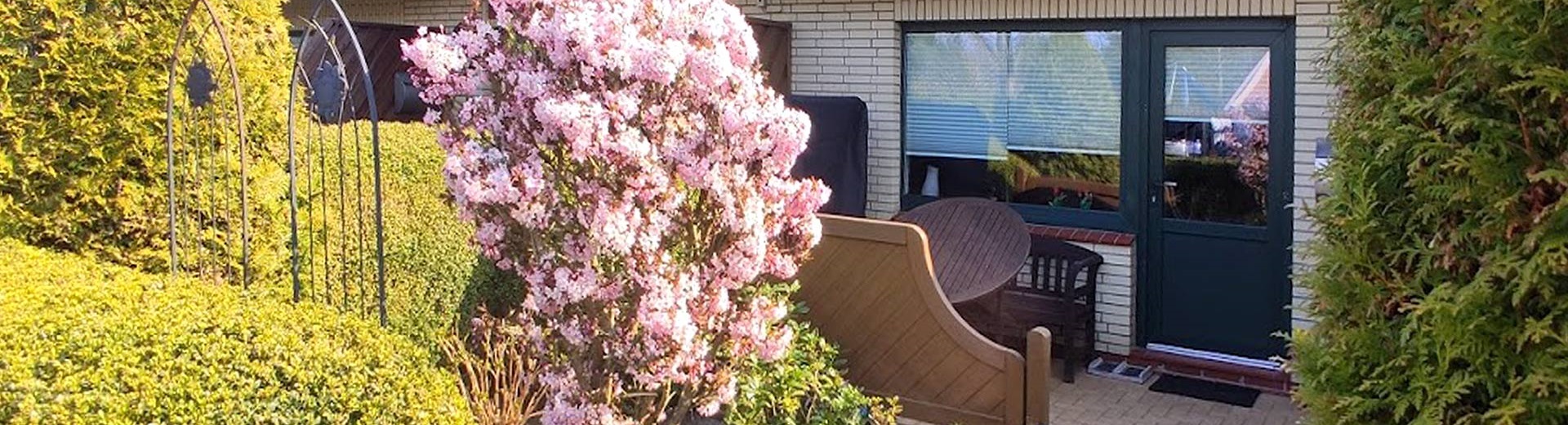 Im Strandkorb und auf den anderen Gartenmöbeln auf der Terrasse genießen Sie das Frühstück. Haustiere sind im Haus Strandhafer nicht erlaubt.