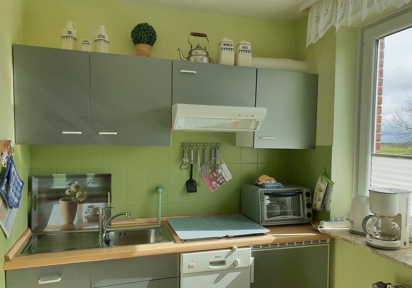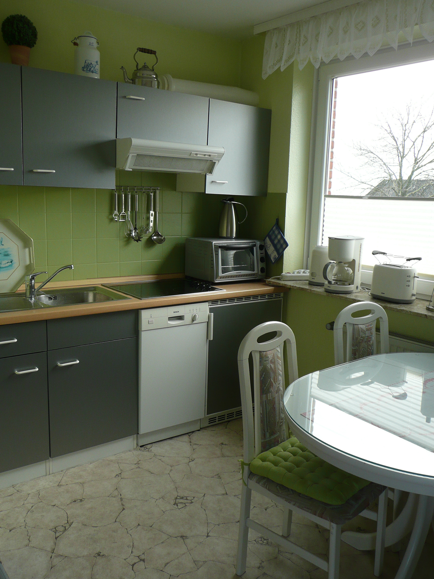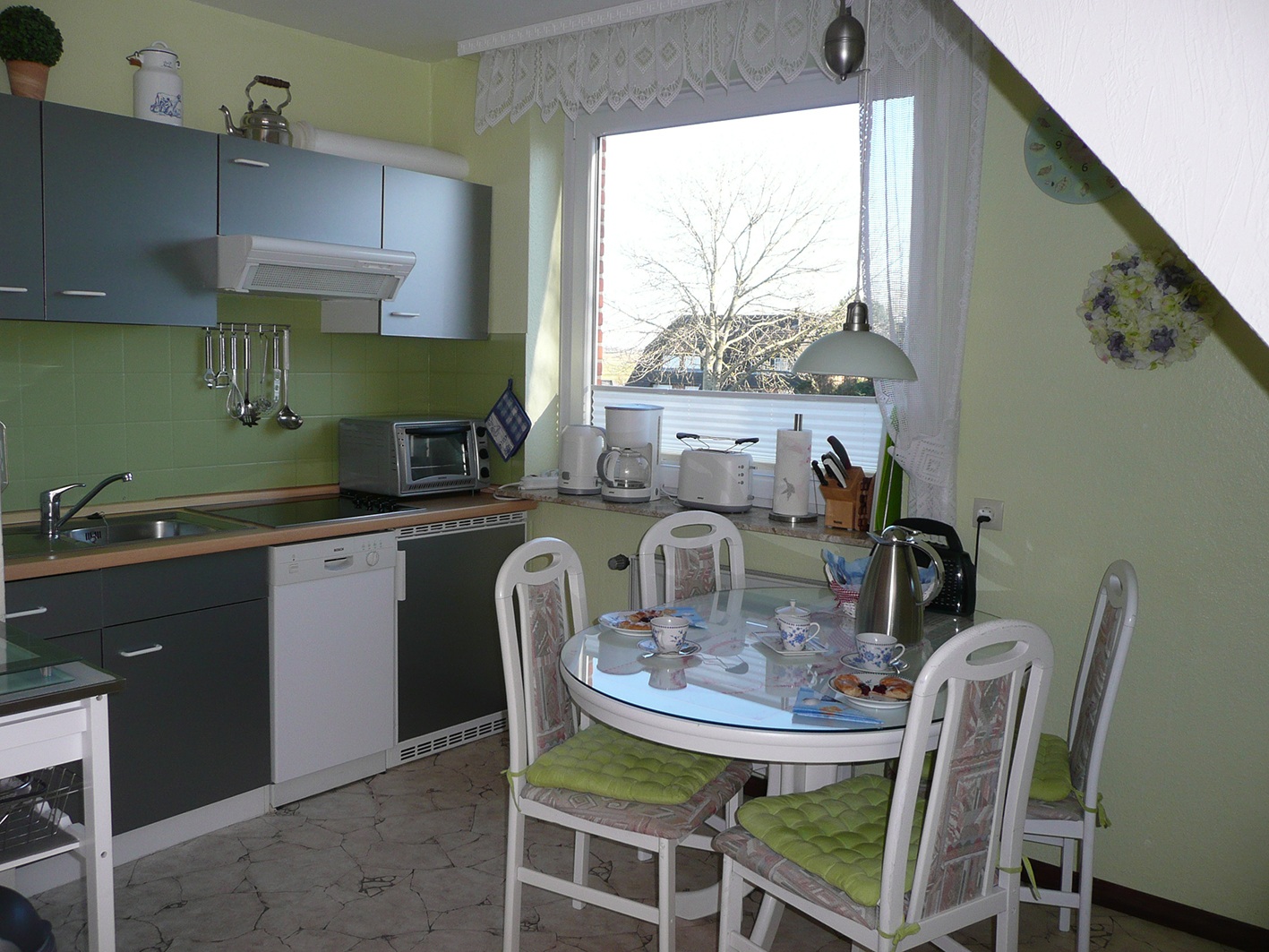 Die helle Küche mit schönem Essplatz bietet viele Annehmlichkeiten.