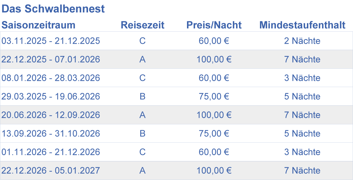 Alle Übernachtungspreise beziehen sich auf die komplette Wohneinheit. Für Kurzurlaube mit bis zu 3 Nächten Aufenthalt wird einmalig ein Zuschlag in Höhe von 30,00 € erhoben.