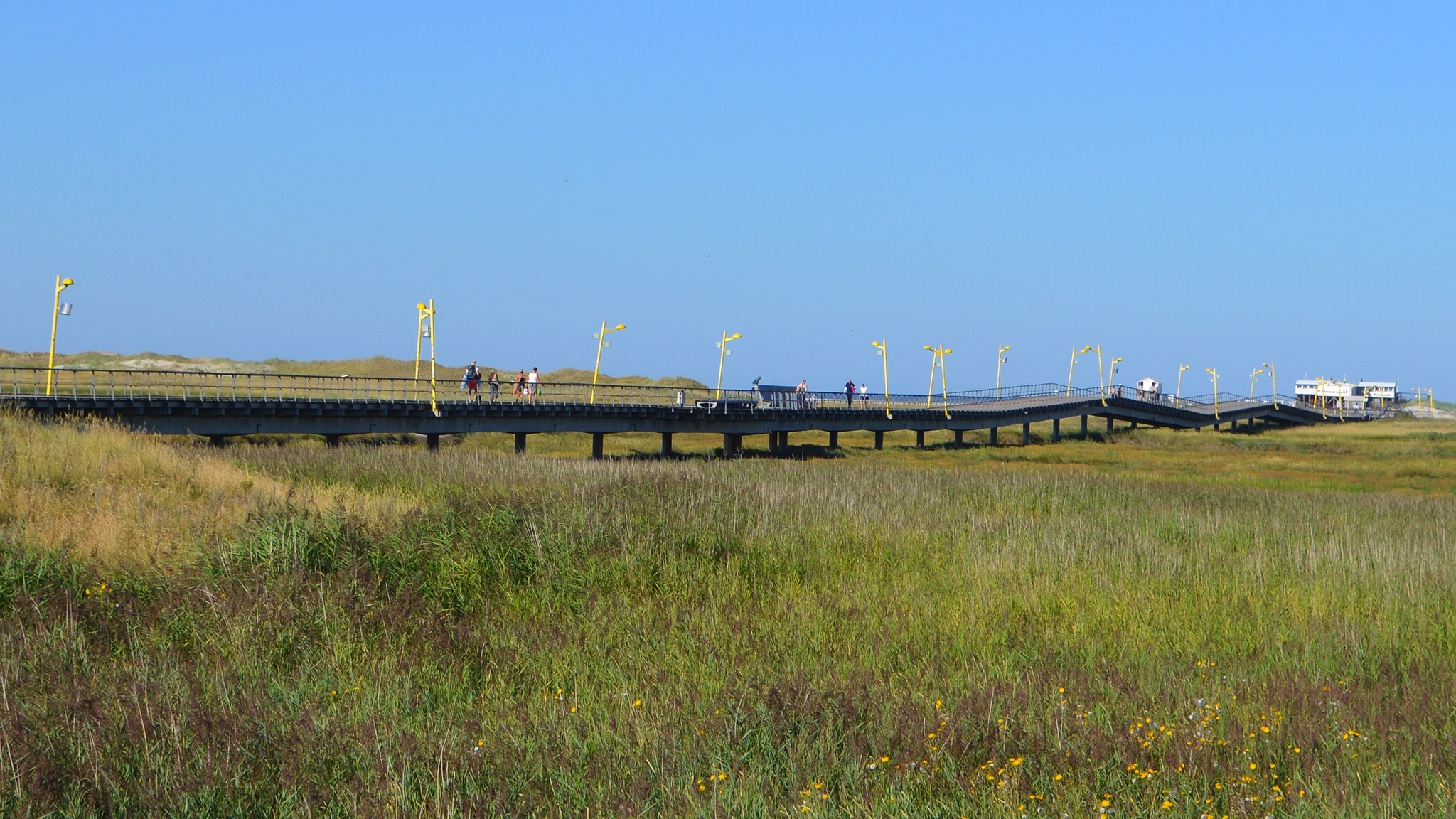 An der Kurpromenade finden Sie am Brückenvorplatz den Zugang zur Seebrücke. Hier locken die Gosch-Erlebnisgastronomie oder das Eiscafé zu einer kleinen Stärkung. Genießen Sie dann den barrierefreien Weg über die Salzwiesen direkt in Richtung Sandstrand. Am Ende der einen Kilometer langen Brücke erwartet Sie schließlich der flach abfallende, familienfreundliche Badestrand. Ob Sie im berühmten Pfahlbau „Arche Noah“ einkehren, die rasanten Kitebuggyfahrer und Strandsegler beobachten oder einfach nur in der Nordsee baden gehen – das ist Ihr purer Urlaub in St. Peter-Ording.