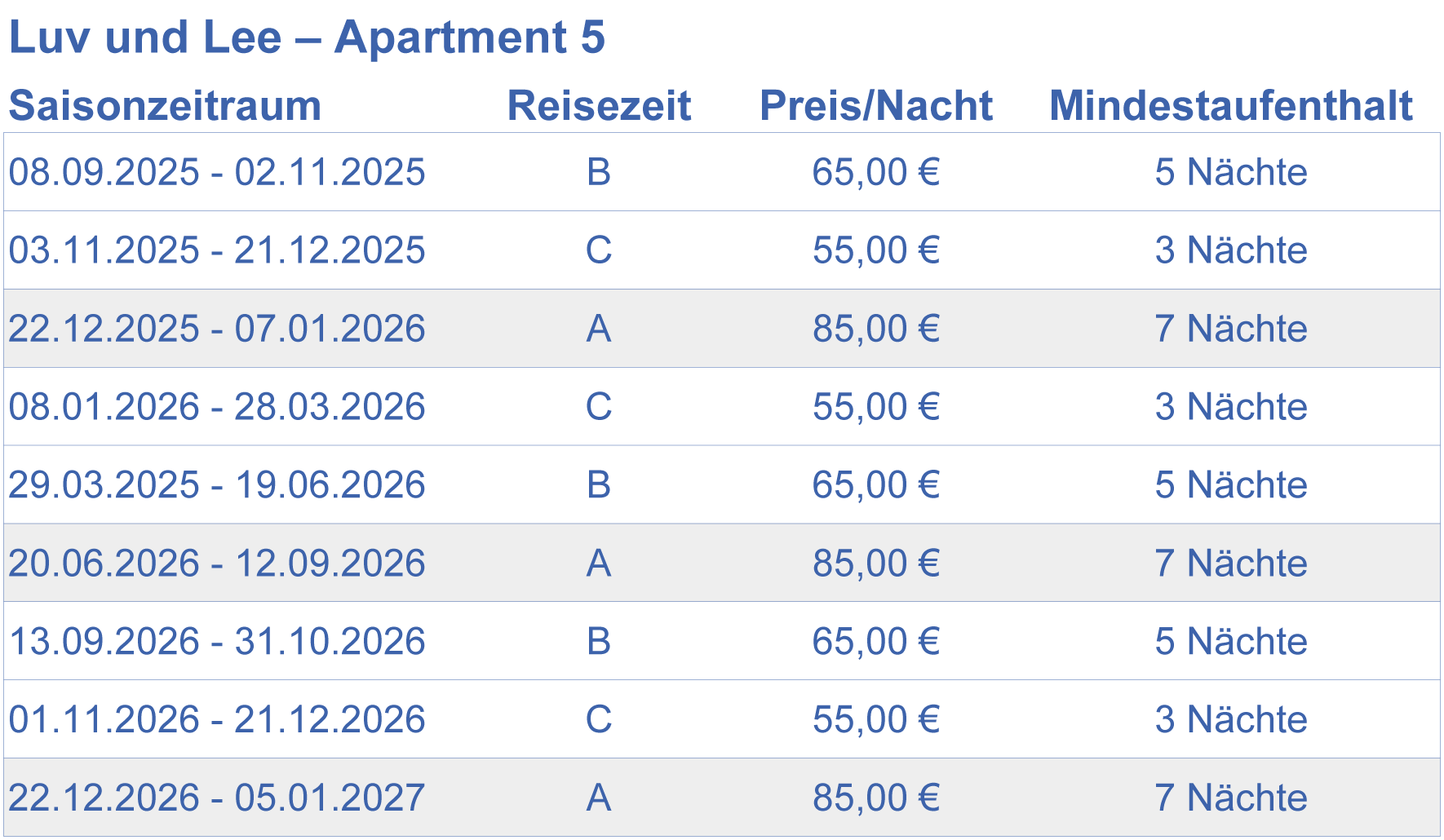 Alle Übernachtungspreise beziehen sich auf die komplette Wohneinheit. Für Kurzurlaube mit bis zu 3 Nächten Aufenthalt wird einmalig ein Zuschlag in Höhe von 30,00 € erhoben.