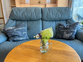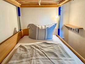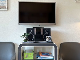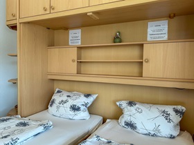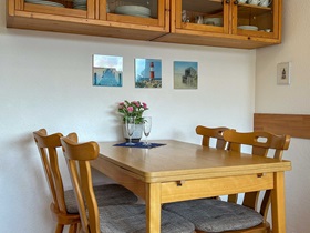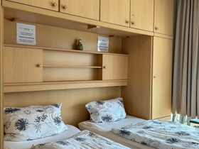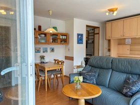 Die Wohnung befindet sich im 1. Stock, ist 45 qm groß und durch ihr großes Panoramafenster sehr hell. Im Wohnzimmer befinden sich eine Schrankwand mit Doppelbetten, ein separater Essplatz für 4 Personen, schöne Sessel, in denen man einen guten Blick auf den neuen Flachbildschirm hat. Die Kochzeile ist mit allem ausgestattet, was gebraucht wird: Backofen, Ceranfeld, Geschirrspüler, Kühlschrank mit Gefrierfach, Wasserkocher, Kaffeemaschine, Toaster sowie ausreichend Geschirr für 4 Personen. Das Duschbad entspricht dem heutigen Standard, ein Fön ist vorhanden. Im zweitem Zimmer befinden sich Doppelstockbetten und ein Leseplatz, zusätzlich verfügt jedes Bett über eine Leselampe und eine Ablage. Der Balkon ist nach Süden ausgerichtet.