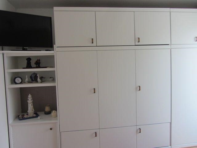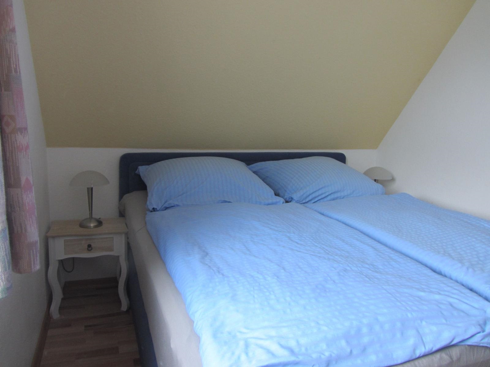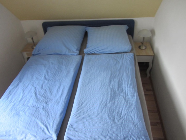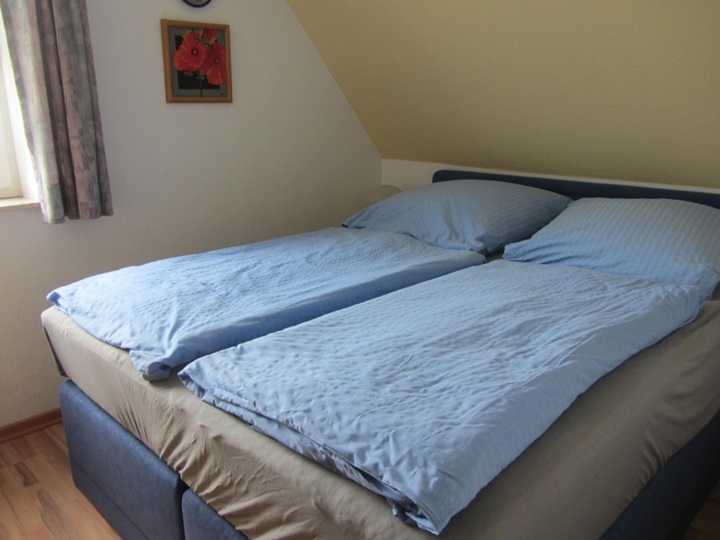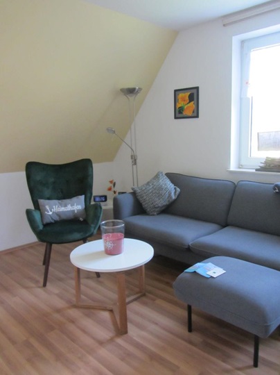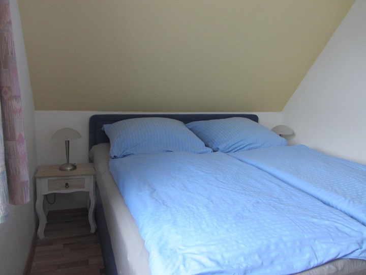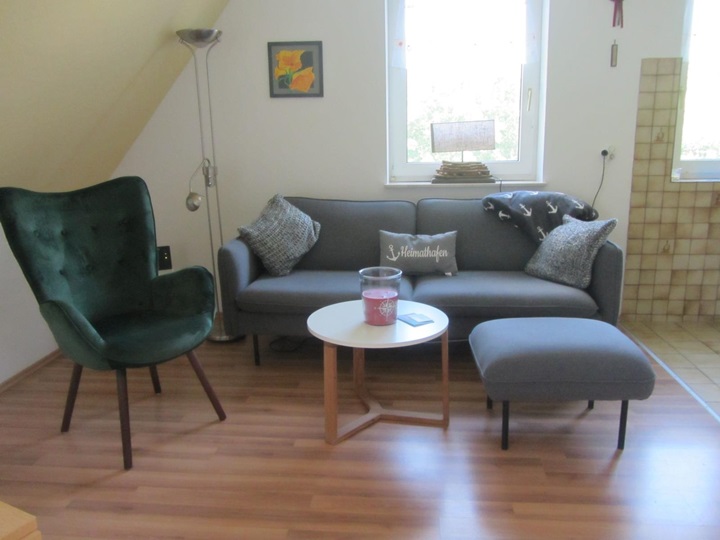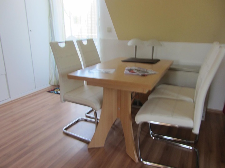 Die Ferienwohnung für 4 Personen befindet sich auf der 1. Etage. Die überwiegend modern eingerichtete Ferienwohnung verfügt über ein Wohn/Schlafzimmer mit 1 Schrankklappbett, einer sehr gemütlichen Couchecke und einem Essbereich mit bequemen Stühlen, von dem aus man auf den Balkon gelangt. Vom kleinen Flur geht ein weiteres kleines Schlafzimmer mit 1 Doppelbett ab und das Badezimmer mit Dusche. Alle Räume sind mit Laminat oder Fliesen ausgelegt. Die Küchenzeile ist mit Backofen, Geschirrspüler, Kaffeemaschine, Toaster, Wasserkocher und erforderlichem Geschirr ausgestattet.