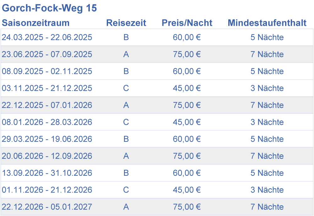Alle Übernachtungspreise beziehen sich auf die komplette Wohneinheit. Für Kurzurlaube mit bis zu 3 Nächten Aufenthalt wird einmalig ein Zuschlag in Höhe von 30,00 € erhoben.