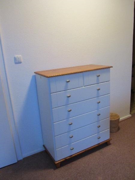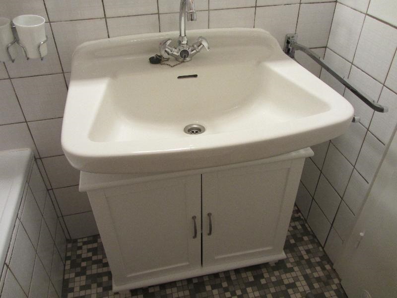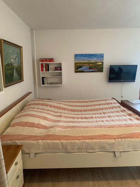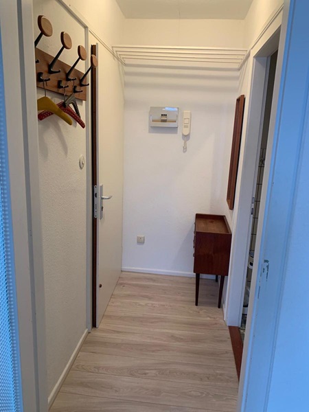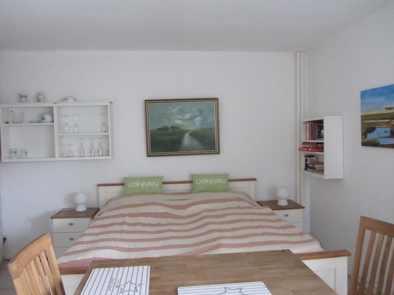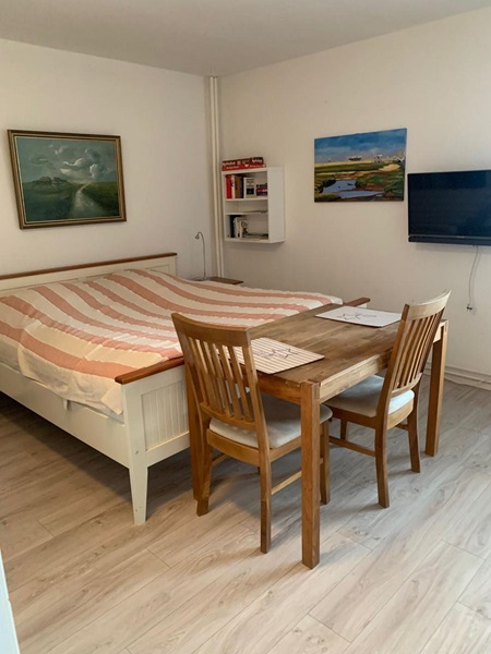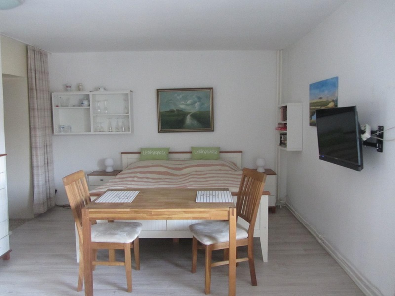 Helle Möbel von guter Qualität. Sie können wenn Sie möchten vom Bett aus Fernsehen da der Flachbildschirm an der Wand angebracht ist und dadurch gut zu verstellen ist. Ein seperater Essplatz und eine praktische Kochzeile mit einem 2 Kochplattenherd, Kühlschrank mit Gefrierfach, Wasserkocher, Kaffeemaschine und Toaster sowie Geschirr ist in ausreichender Menge ist vorhanden. Eine Besonderheit an diesem Apartment ist das Vollbad mit Duschvorrichtung. Die Wohnung ist mit dem Fahrstuhl erreichbar.