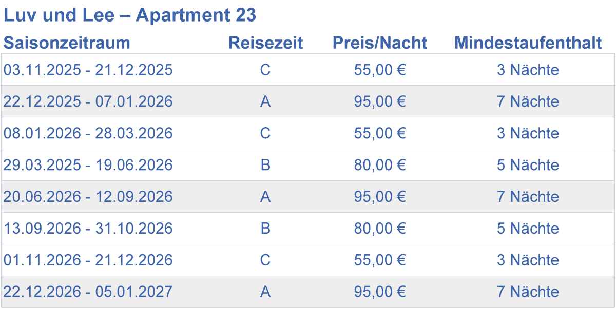 Belegzeitenkalender für Luv und Lee Apartment 23