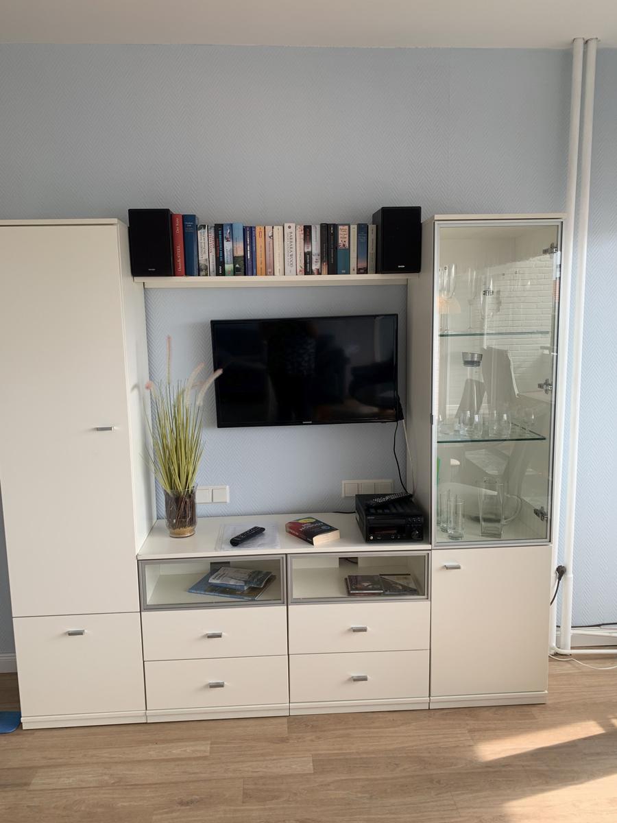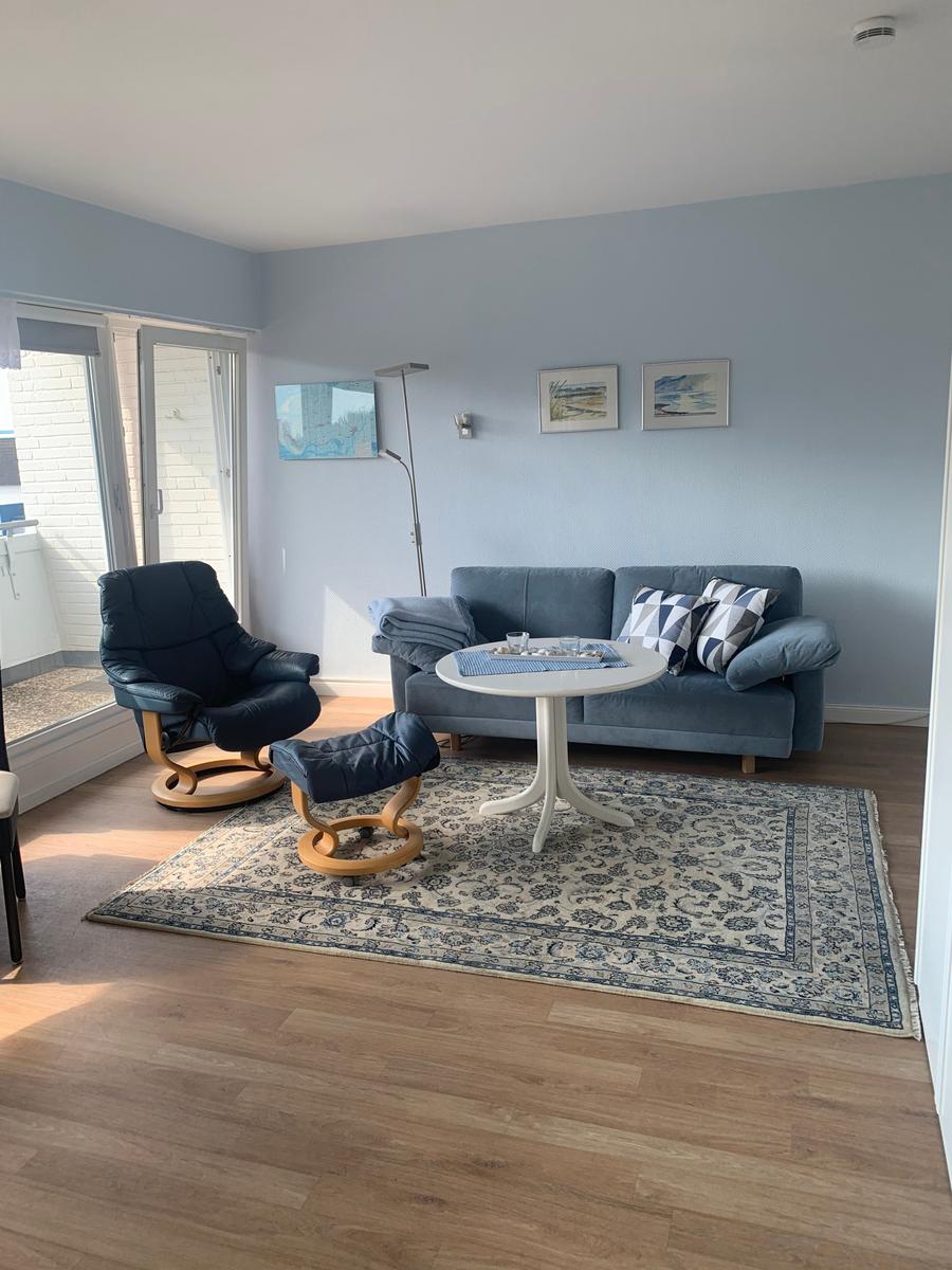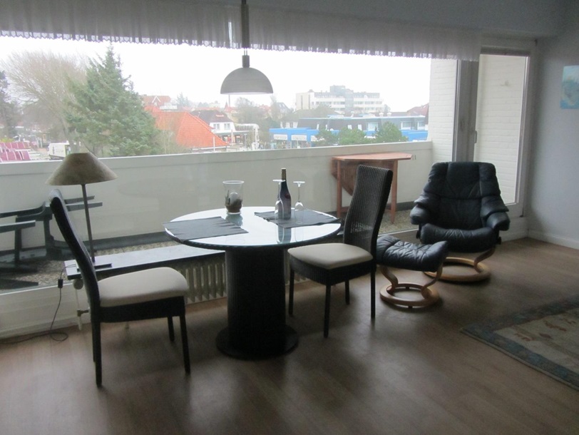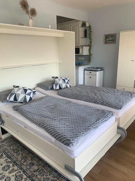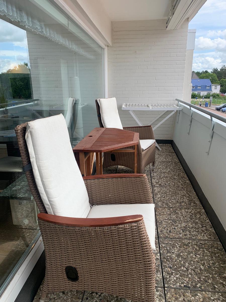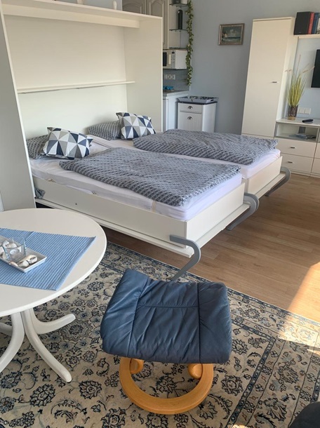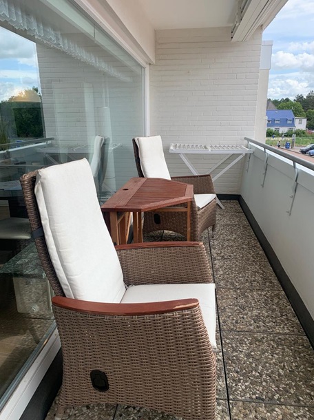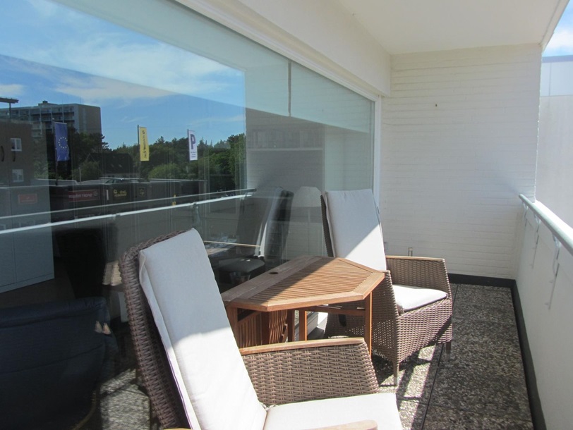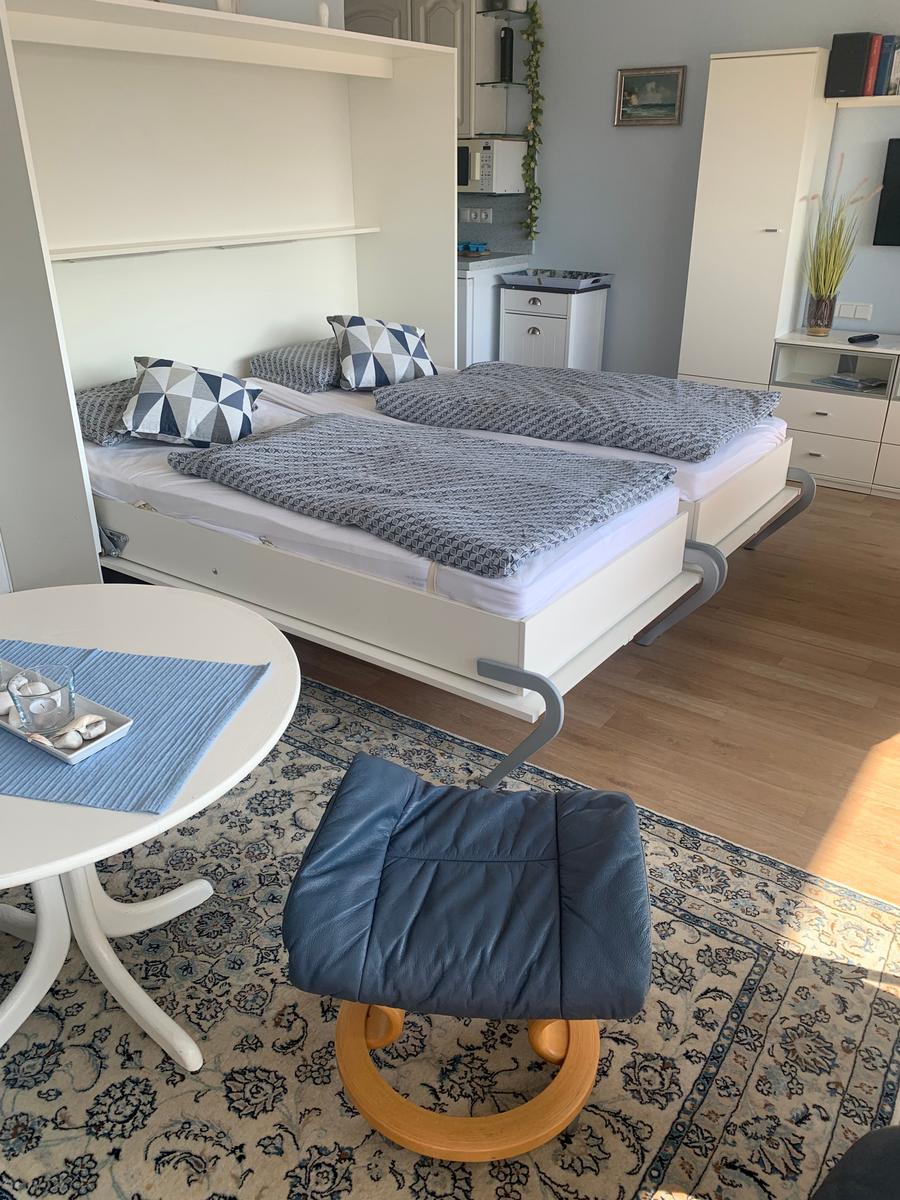 Das in der 2. Etage gelegene Apartment und hat durch seinen großen Balkon und ein großes Panoramafenster bringt durch seine Lage nach Süden den ganzen Tag Sonne. Der Wohn/Schlafbereich ist mit hellen Möbeln einer schönen Sitzganitur und einem seperaten Essplatz ausgestattet. Das Doppelbett befindet sich in der Schrankwand. Die Küchenzeile verfügt über eine Ceranfeld und einen Backofen, Kühlschrank mit Gefrierfach und Kaffeemaschine, Wasserkocher, Toaster Geschirr ist in ausreichender Menge vorhanden. Das Duschbad verfügt über einen Handtuchtrockner ein Fön ist vorhanden.