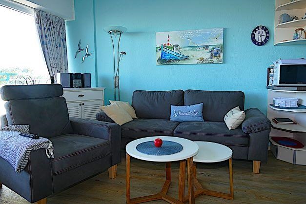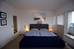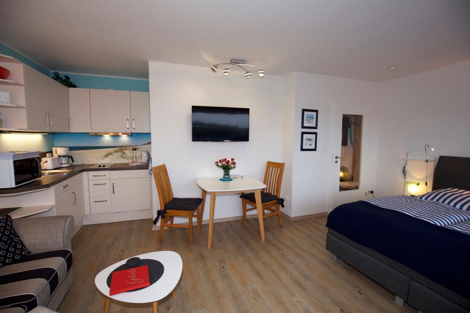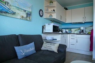 Großer Wohn- und Schlafbereich, Essplatz, Doppelbett, Küchenzeile mit Ceranfeld, Kühlschrank mit Gefrierfach, Kaffeemaschine, Wasserkocher, Toaster und ausreichend Geschirr. Großer Balkon mit herrlicher Aussicht zum Ordinger Strand und zum Westerhever Leuchtturm.