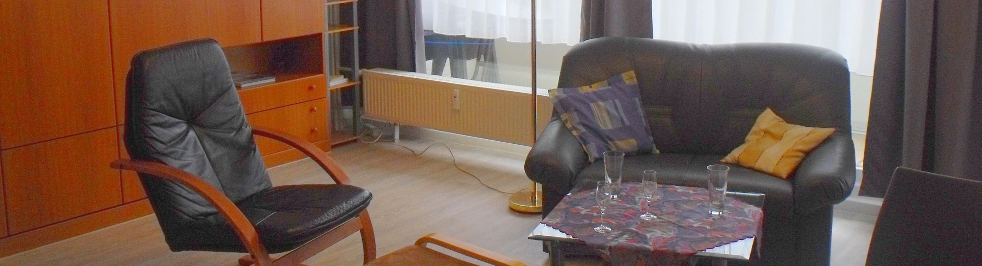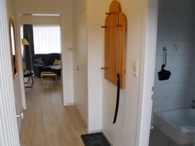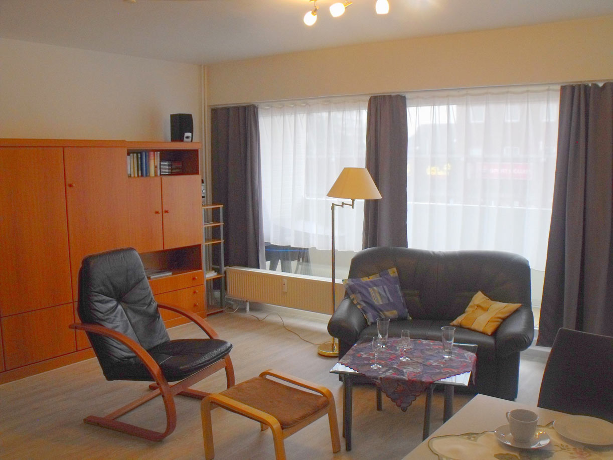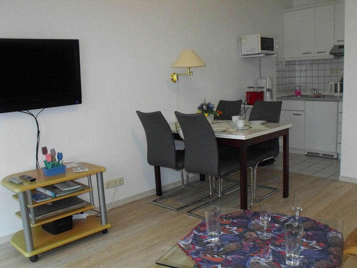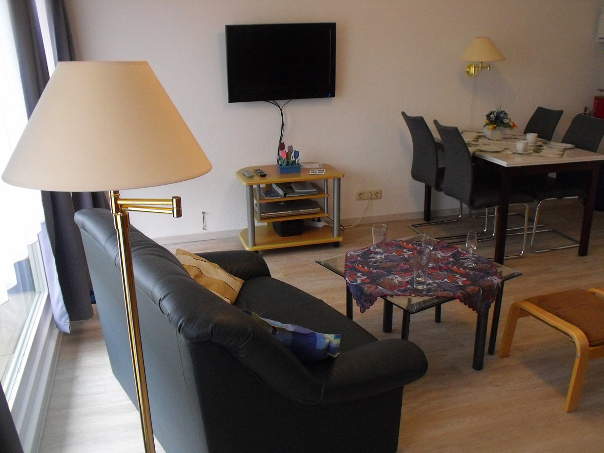 Das modern eingerichtete Apartment im 1. Obergeschoss verfügt über ein Wohnzimmer mit Schrankklapp-Doppelbett , eine Sitzgruppe und einen gesonderten Essbereich. Angrenzende Küchenzeile mit 2 Kochplattenherd, Kühlschrank mit Gefrierfach, Kaffemaschine, Waserkocher und Toaster. Im separates Schlafzimmer befinden sich 2 Einzelbetten. Modernes Duschbad mit Fön. Großzügiger Süd-Balkon. Ein Flachbild-Fernseher und ein DVD-Player inkl. DVDs sind vorhanden, ebenso eine Stereo-Anlage mit Abspielmöglichkeiten von MC und CD (inkl. CDs). Leseratten finden verschiedene Bücher vor.