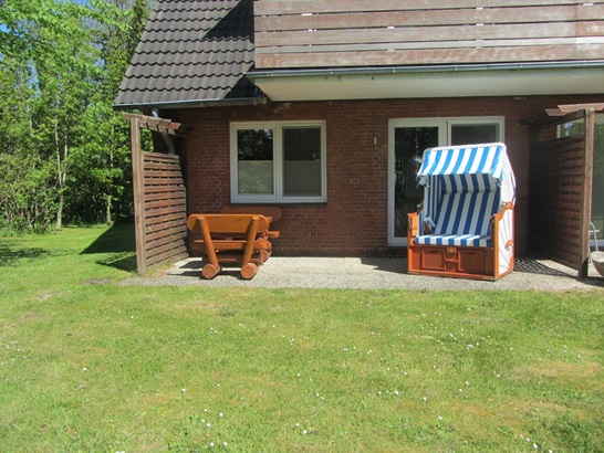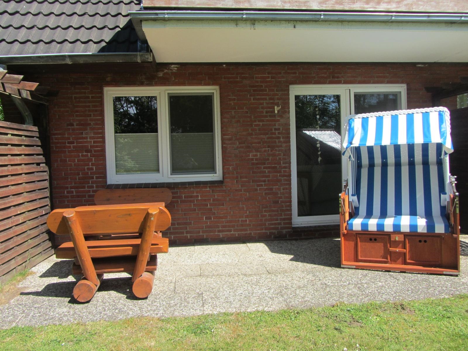 Die Wohnung hat einen separaten Eingang. Die mit Holzgartenmöbeln und Strandkorb ausgestattete Süd-Terrasse lädt zu einem Frühstück in der Sonne ein. Vor der Terrasse ist eine nach Süden gelegene, etwa 500 qm große Liegewiese.