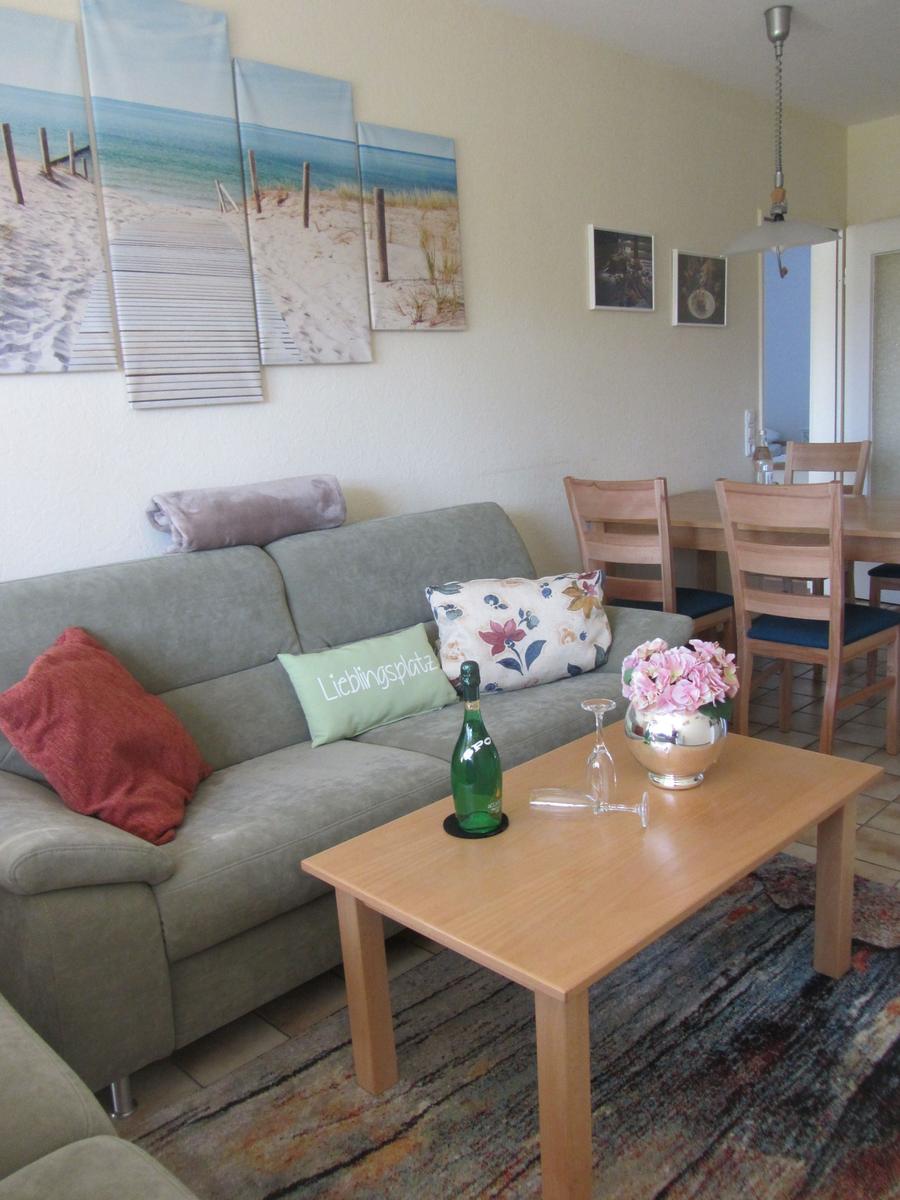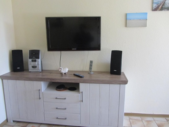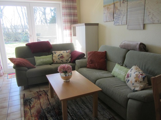 Vom Wohnzimmer gelangen Sie auf die schöne Südterrasse mit Strandkorb und Gartenmöbeln. Die Schlafzimmer sind durch einen Flur vom Wohnzimmer getrennt. Zur Ausstattung der Wohnung gehören Flachbildfernseher, eine Geschirrspülmaschine und die Internetnutzung über einen Hotsplot. Die gesamte Wohnung ist gefliest, vor den Fenstern und der Terrassentür befinden sich Fliegengitter. Ein Kinderreisebett sowie ein Kinderstuhl können gestellt werden.