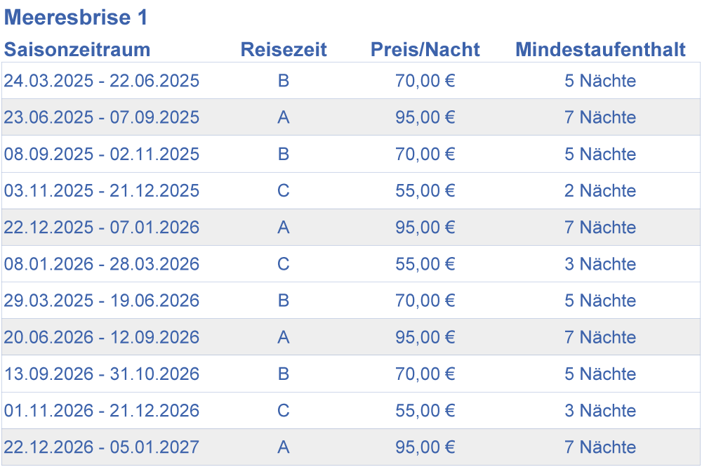 Alle Übernachtungspreise beziehen sich auf die komplette Wohneinheit. Für Kurzurlaube bis zu 3 Nächten Aufenthalt wird einmalig ein Zuschlag in Höhe von 30,00 € erhoben.