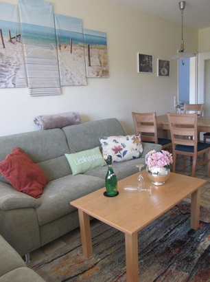 Die gut ausgestattete und ansprechend eingerichtete Wohnung ist 56 qm groß. Sie verfügt über ein Wohn-/Esszimmer, eine Einbauküchenzeile im Eingangsbereich, ein Schlafzimmer mit Doppelbett, ein Schlafzimmer mit zwei Einzelbetten und ein Tageslichtbad mit WC und Dusche. Ein Fön ist vorhanden.