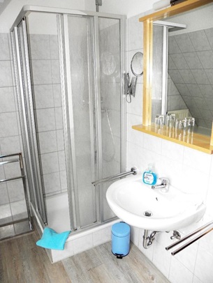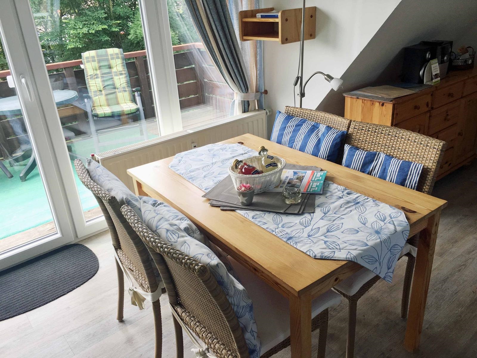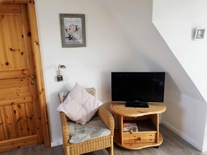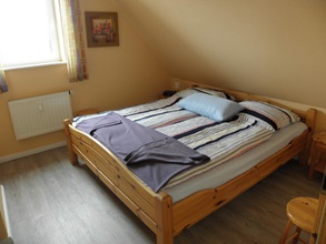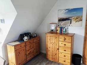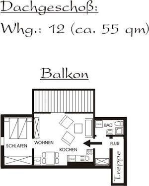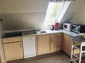 In der geschmackvoll eingerichteten DG-Wohnung befindet sich ein Schlafzimmer, dass mit einem großen Doppelbett und einem geräumigen Schrank ausgestattet ist. Im Wohnraum befindet sich ein Schlafsofa mit Tisch und zwei Sesseln, ein Essplatz mit Tisch und Stühlen und eine Einbauküche, sowie ein Flachbild-Farb-TV. Die Einbauküche ist mit einem 4-Platten-Ceran-Kochfeld, Geschirrspüler, Mikrowelle, einem Mini-Backofen, Kühlschrank, Kaffeemaschine, Toaster, Wasserkocher und erforderlichem Geschirr ausgestattet. Im Bad sind Waschbecken WC und Dusche sowie eine geräumige Ablage. WLAN über Hotsplots kostenfrei.