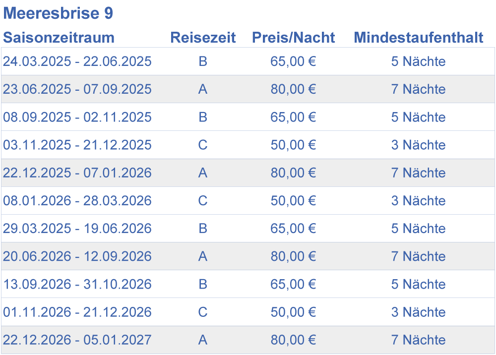 Alle Übernachtungspreise beziehen sich auf die komplette Wohneinheit. Für Kurzurlaube mit bis zu 3 Nächten Aufenthalt wird einmalig ein Zuschlag in Höhe von 30,00 € erhoben.